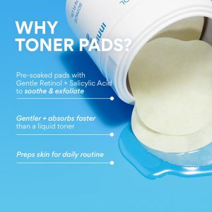 Biodegradable. daily toner pads with Gentle Retinol + salicylic acid to calm redness. hydrate. and gently exfoliate.