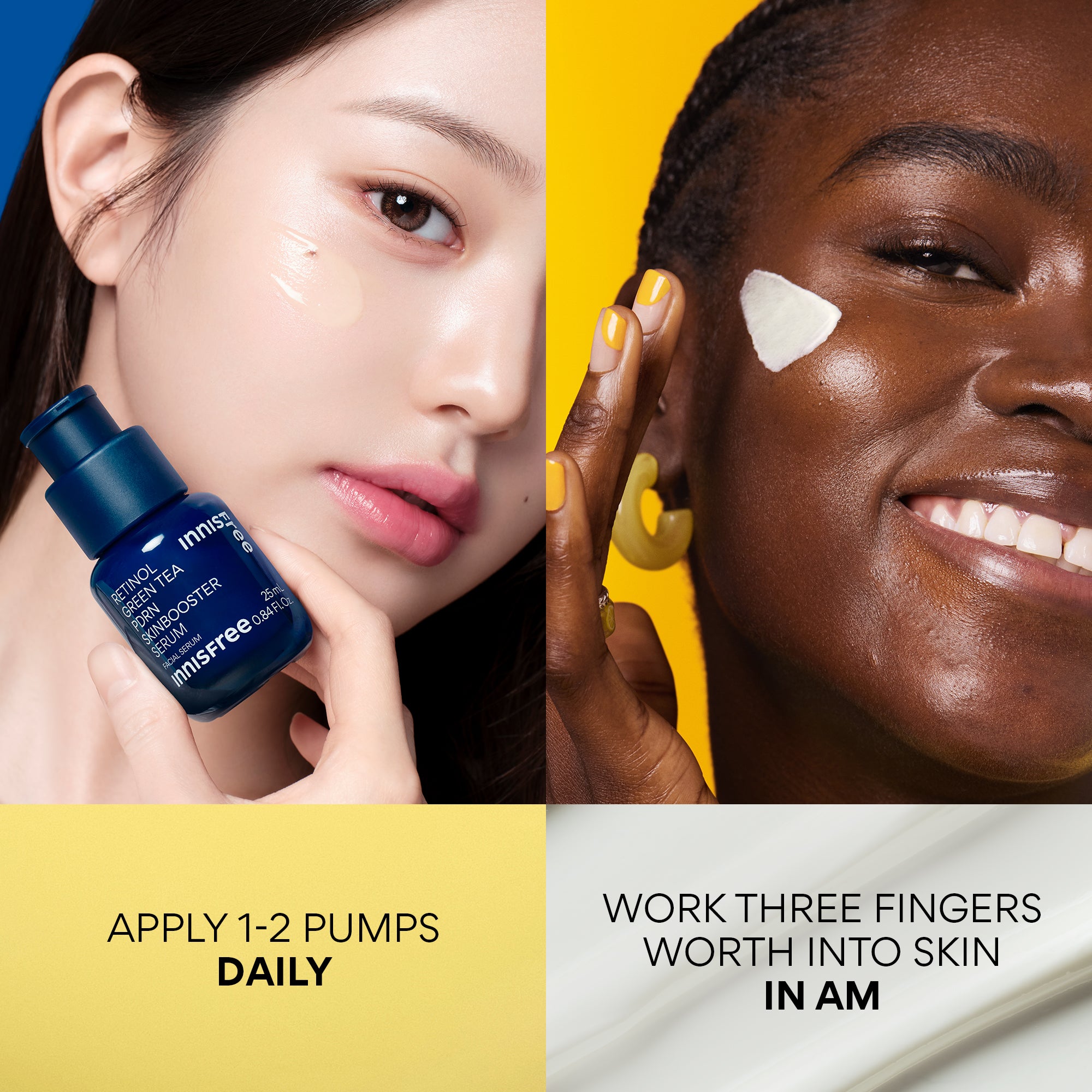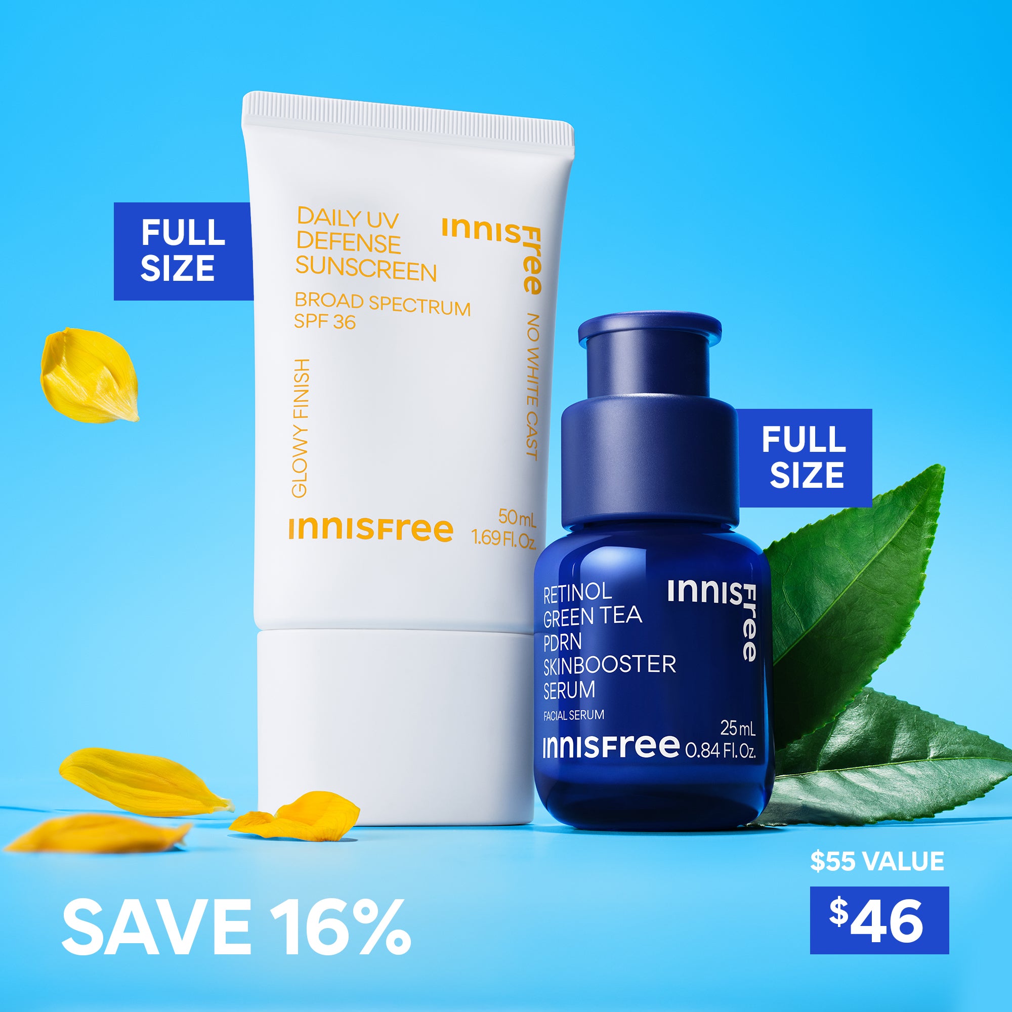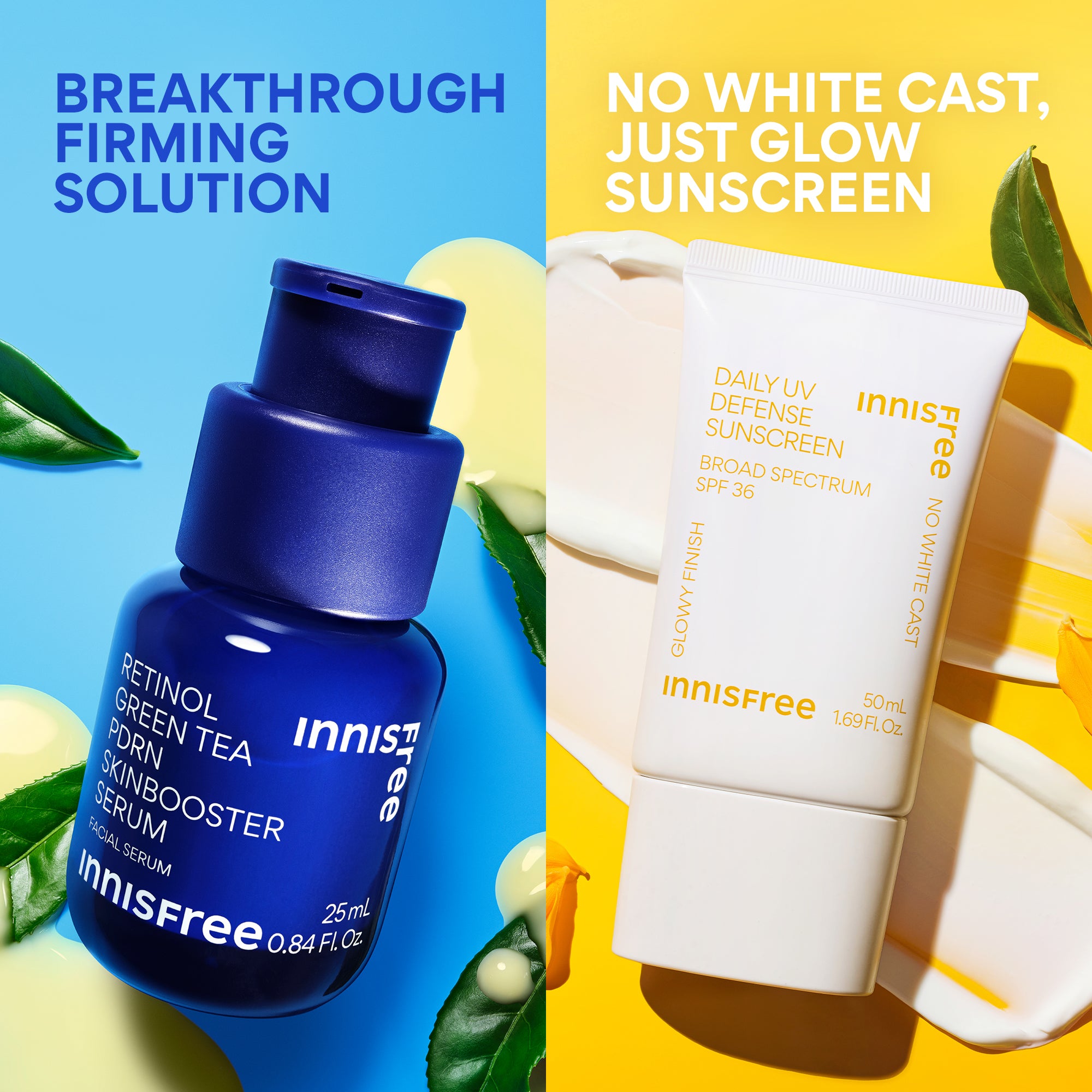 Visibly firm + protect skin with our Firm + Protect Duo. This bundle includes a full size Retinol Green Tea PDRN Skinbooster Serum and a full size of our cult-fave Daily UV Defense Sunscreen SPF 36. Apply Green Tea PDRN Serum to help enhance elasticity and visibly firm skin. Then. follow with Daily UV Defense Sunscreen in the AM.