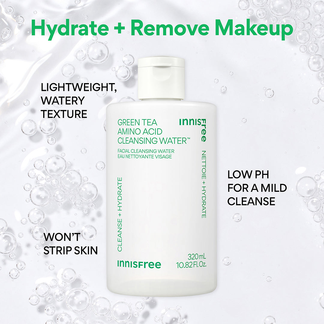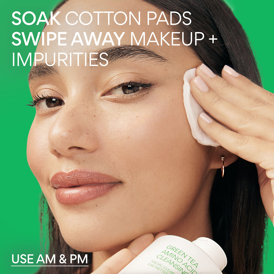 A mild micellar water with Green Tea and a moisturizing Amino Acid Complex that cleanses away light makeup and impurities while refreshing skin.