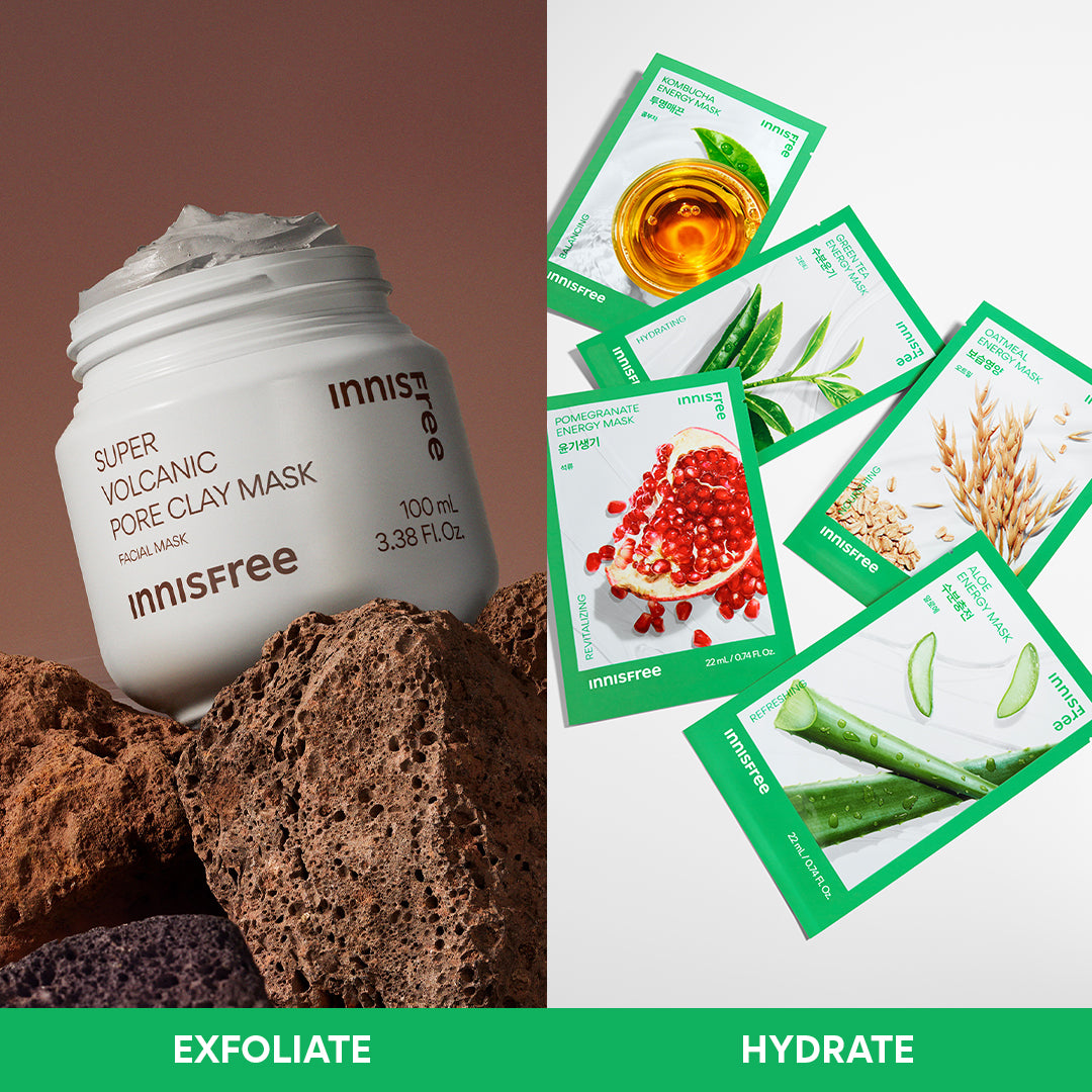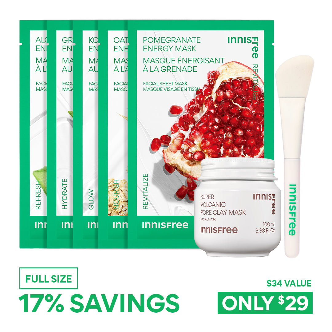 Treat yourself to some much-needed relaxation this winter with our exclusive. limited-edition bundle! This special set features our beloved Super Volcanic Pore Clay Mask. perfect for clearing pores and exfoliating your skin. It also includes a handy clay mask applicator and all five varieties of our rejuvenating Energy Sheet Masks. designed to give your skin a radiant. hydrated glow.